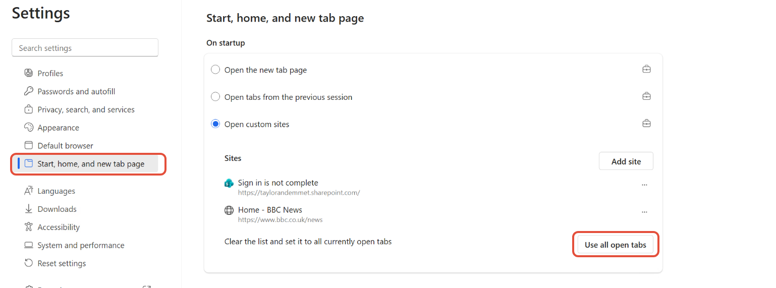 Next, from the left-hand panel, go to Start, home, and new tab page. Click the Use all open tabs button to add them to your startup list.